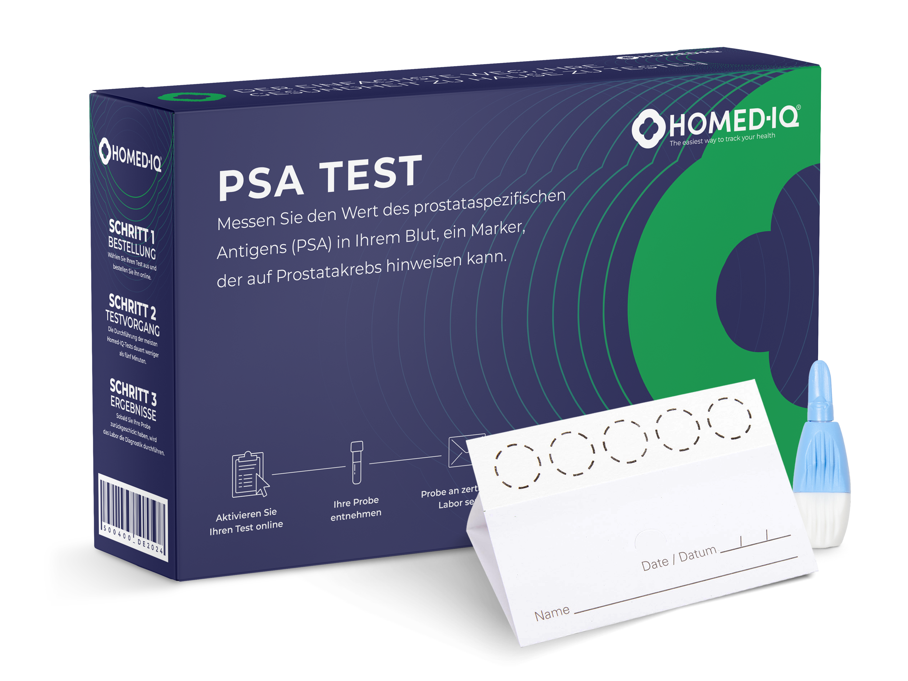 Prostataspezifisches Antigen (PSA) ist ein Protein, das von der Prostata produziert und in geringen Mengen ins Blut abgegeben wird. Ein erhöhter PSA-Spiegel kann auf ein Problem mit der Prostata hinweisen, beispielsweise auf Prostatakrebs oder Entzündungen. Der PSA-Test kann helfen, Prostatakrebs in einem frühen Stadium zu erkennen. Dieser Heimtest misst den PSA-Wert im Blut und kann erhöhte Werte identifizieren, die auf mögliche Erkrankungen der Prostata hindeuten.